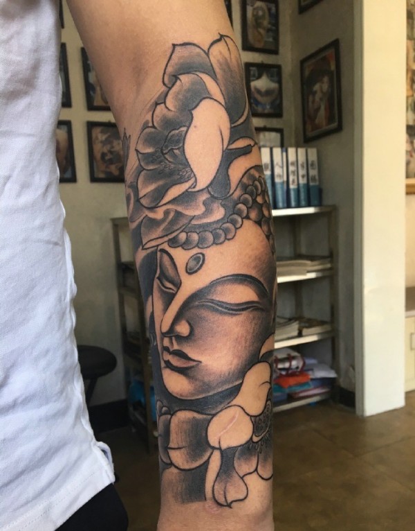 莲花与佛像结合的黑灰手臂纹身