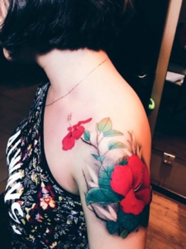 女生肩花纹身_15张女性双肩对称的肩花纹身图案作品图片