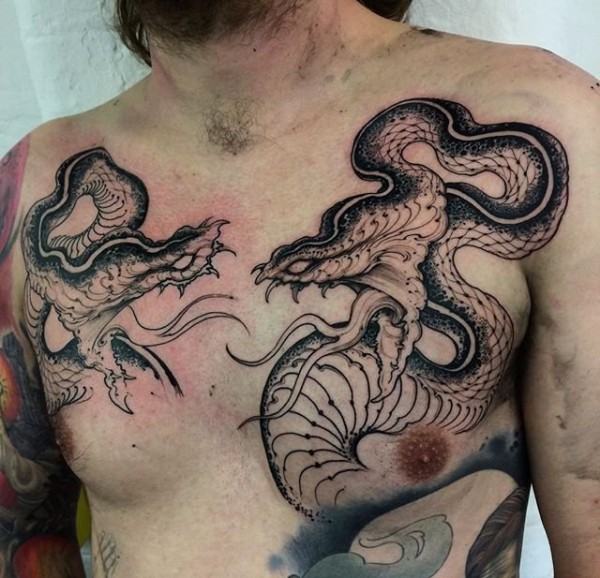 缠绕着骨架骷髅头的怪物蛇图案纹身