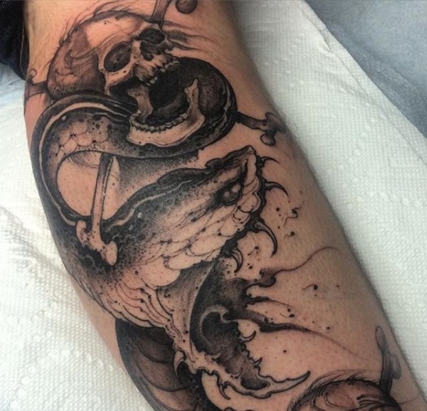 缠绕着骨架骷髅头的怪物蛇图案纹身