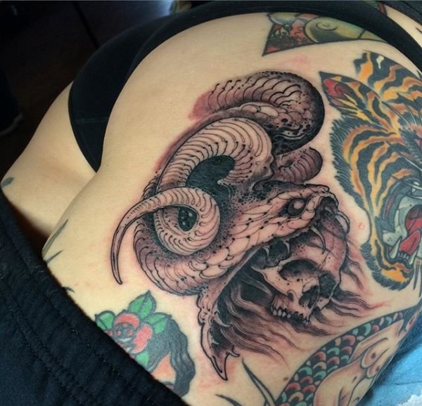 缠绕着骨架骷髅头的怪物蛇图案纹身