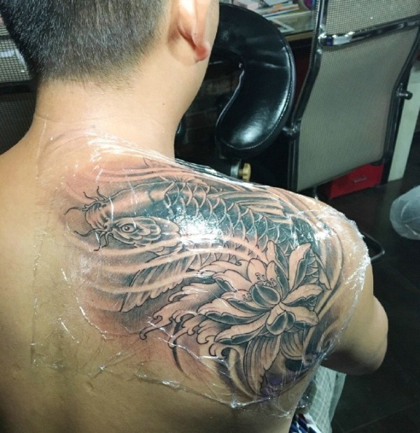 马上完成的肩膀莲花鲤鱼纹身刺青