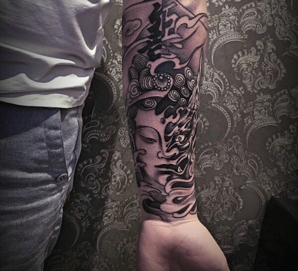佛与魔拼接而成的手臂纹身图案