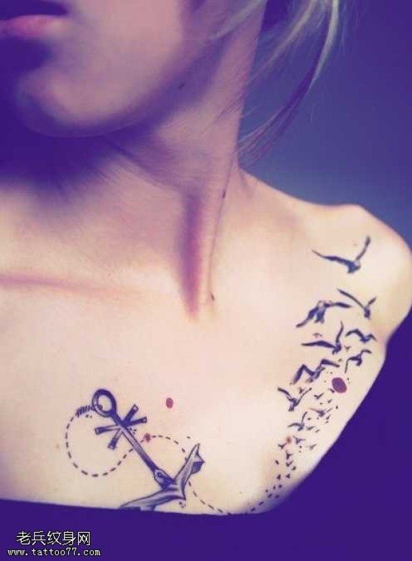 胸部船锚小鸟纹身图案