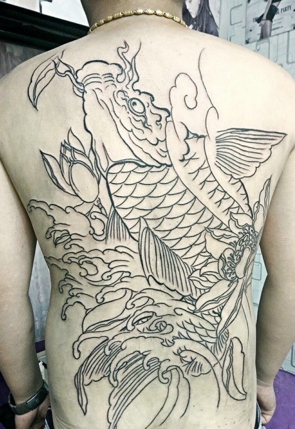 满背线条大鲤鱼纹身图案即将完成
