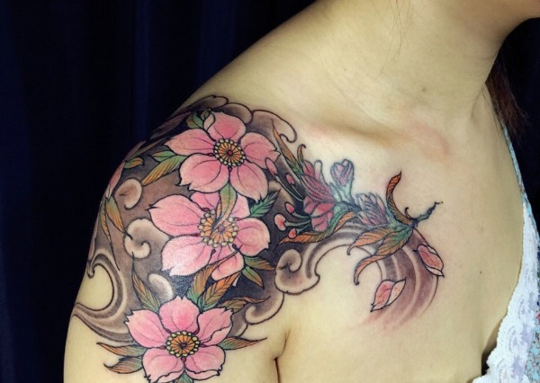 女生肩花纹身_15张女性双肩对称的肩花纹身图案作品图片