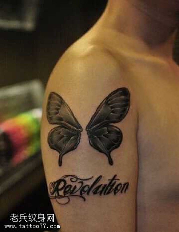 胳膊黑灰蝴蝶英文纹身图案