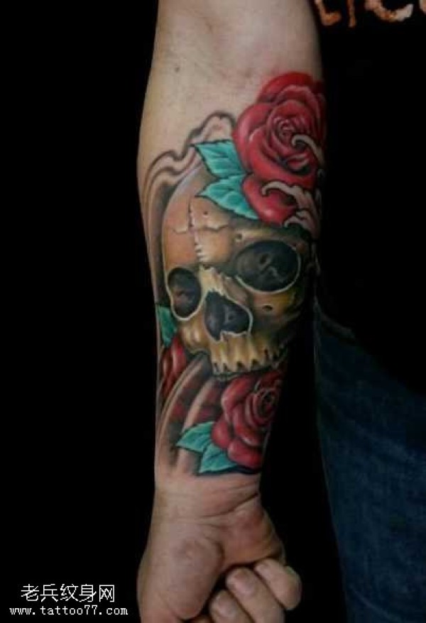 女生手臂经典潮流的骷髅与玫瑰花纹身图案