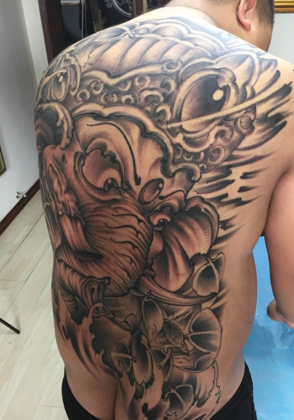 满背魅力十足的大象神纹身图案