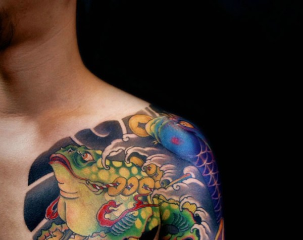 鲤鱼与青蛙结合的彩色半甲纹身图案