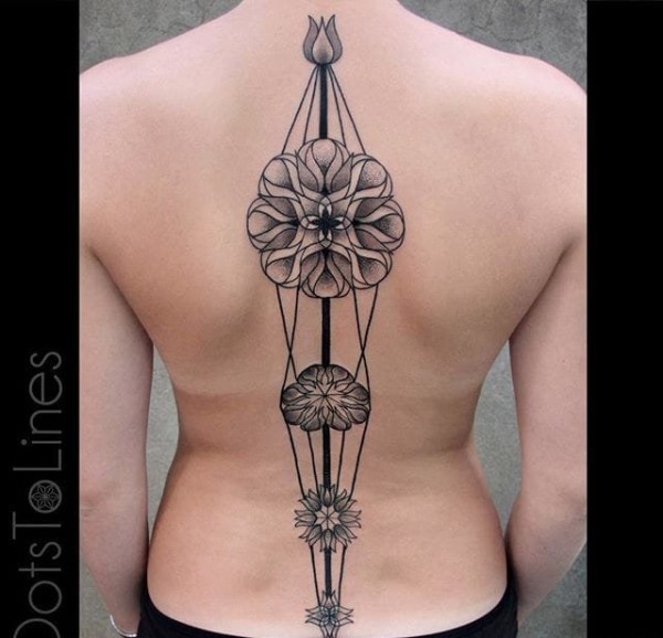 脊椎骨上的直线和几何图形纹身