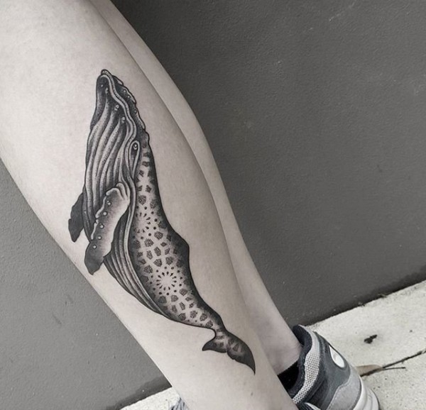 男子侧肋上的带着夜景图案的鲸鱼纹身图案