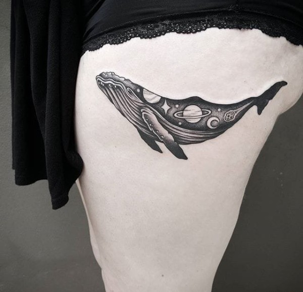 男子侧肋上的带着夜景图案的鲸鱼纹身图案
