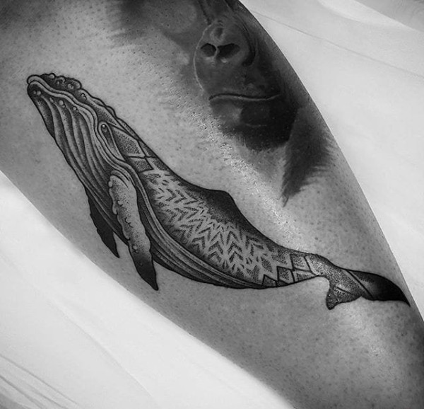 男子侧肋上的带着夜景图案的鲸鱼纹身图案