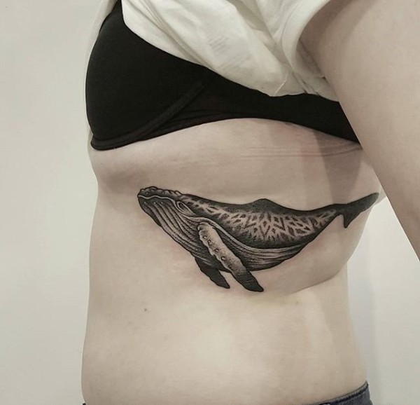 男子侧肋上的带着夜景图案的鲸鱼纹身图案