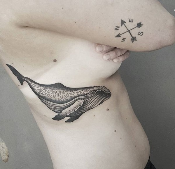 男子侧肋上的带着夜景图案的鲸鱼纹身图案