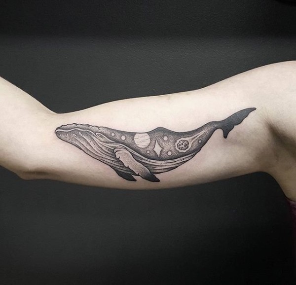 男子侧肋上的带着夜景图案的鲸鱼纹身图案
