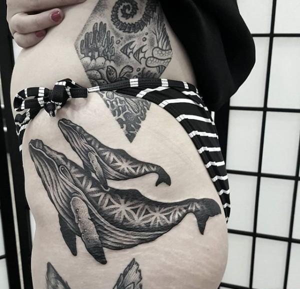 男子侧肋上的带着夜景图案的鲸鱼纹身图案