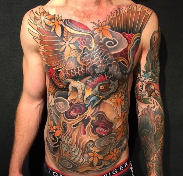 肚子上大骷髅头骨满胸大鸟纹身图案
