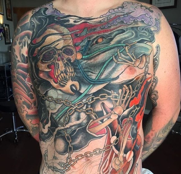 肚子上大骷髅头骨满胸大鸟纹身图案