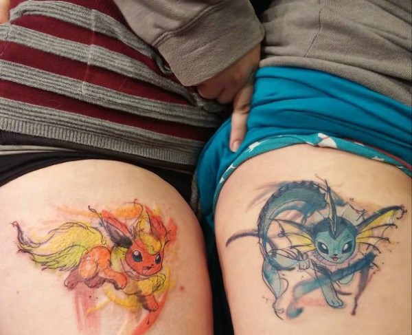 大腿外侧水彩另类卡通情侣纹身图案