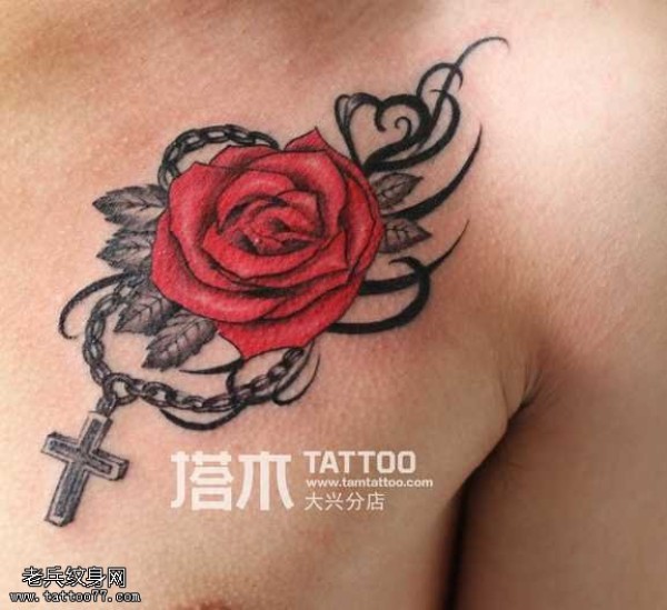 胸部红玫瑰纹身图案