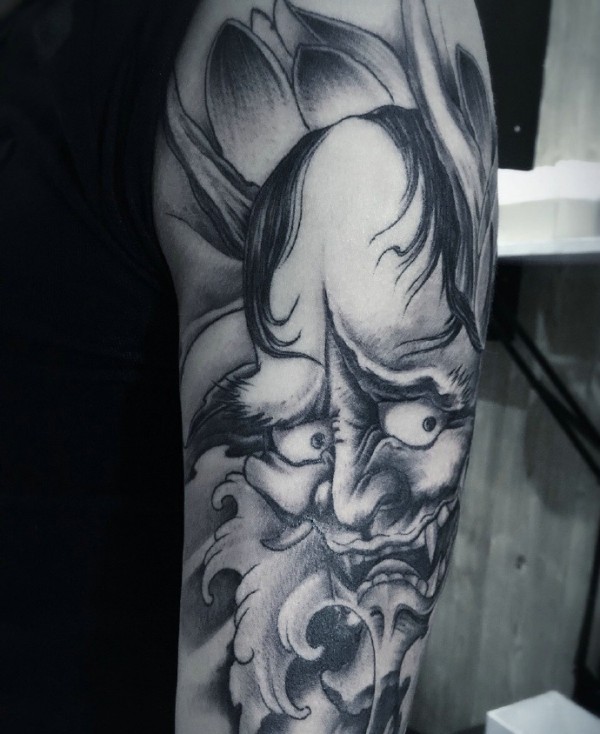 大臂凶恶的黑白般若纹身图案