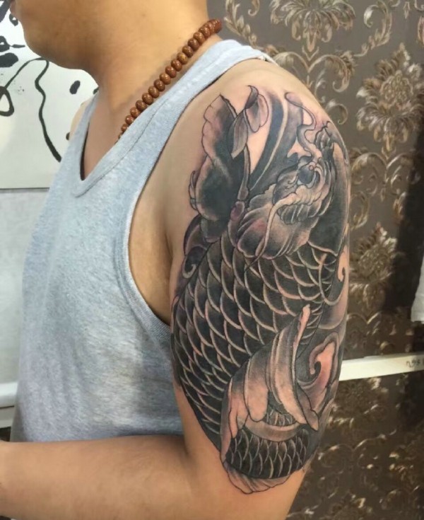 莲花与鲤鱼的大臂黑白纹身图案