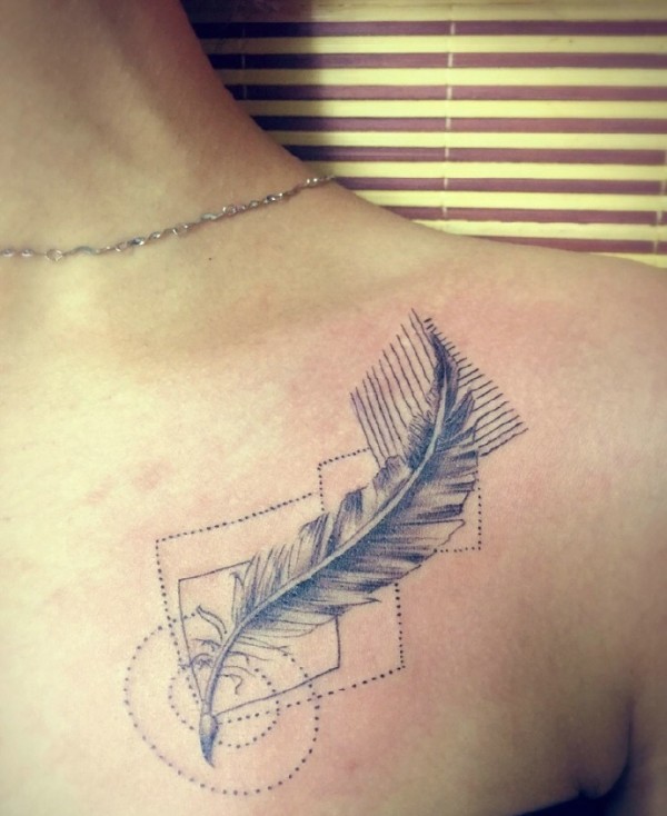 女生胸前几何与羽毛结合的纹身图片