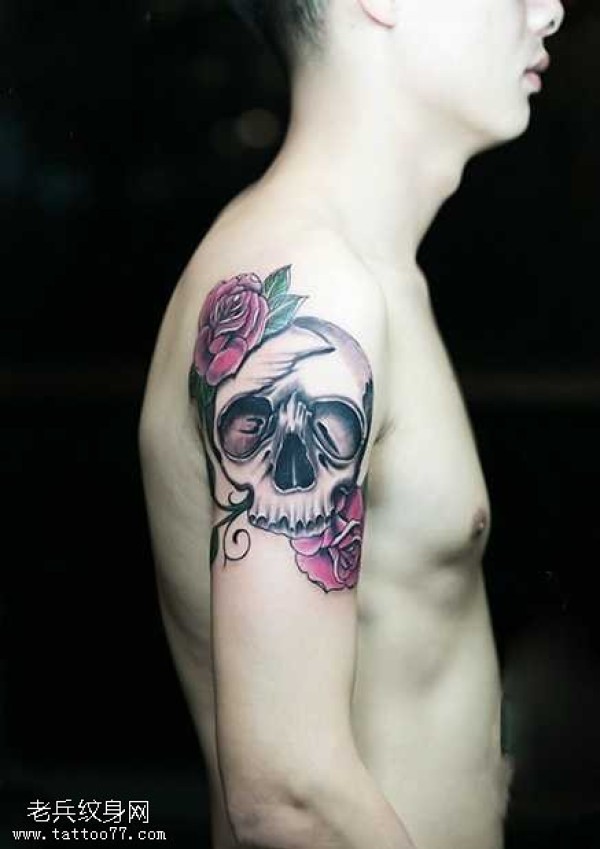 女生手臂经典潮流的骷髅与玫瑰花纹身图案