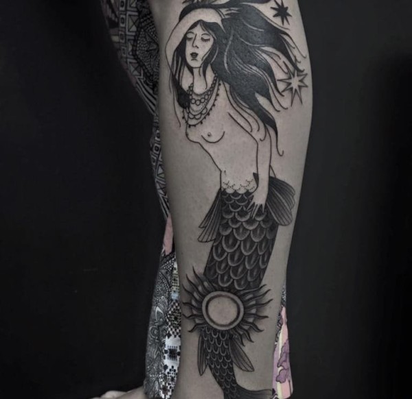 男子手臂上拿着剑的邪恶的美人鱼纹身图案