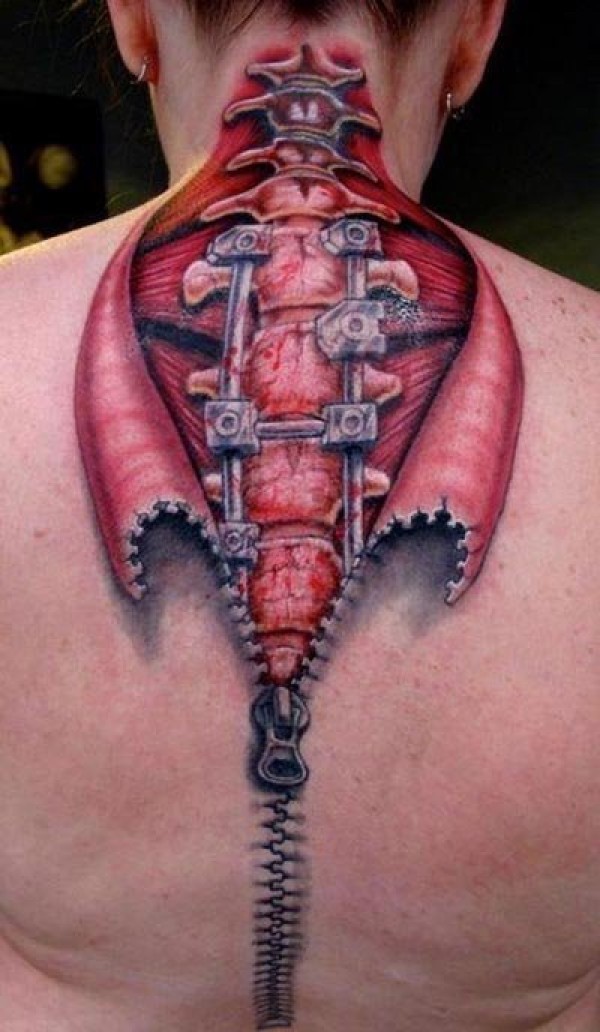 背上的皮就像是拉链拉开露出骨头一样的3D纹身图案
