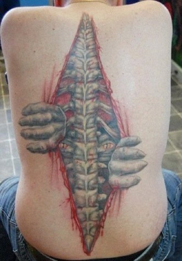 背上的皮就像是拉链拉开露出骨头一样的3D纹身图案