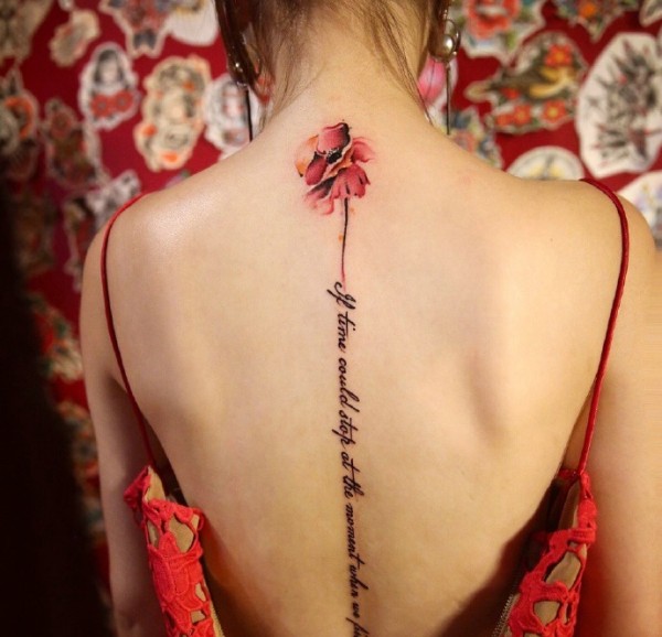 花朵与英文一起的脊椎部纹身刺青