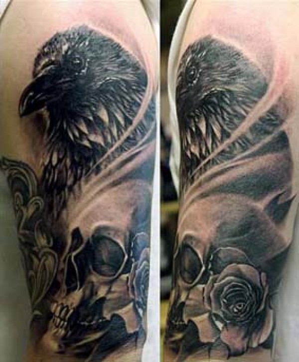 超帅时尚的黑灰骷髅与蛇纹身图案
