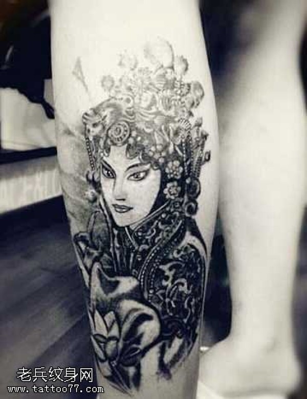 腿部黑花旦纹身图案