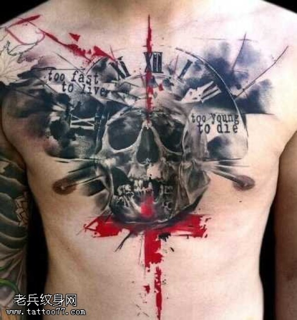 胸部水墨英文骷髅纹身图案