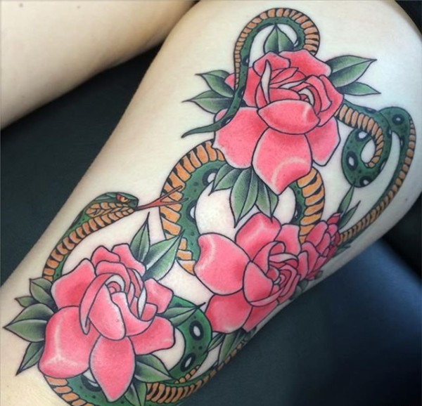 大腿上漂亮的玫瑰花与蛇纹身图案