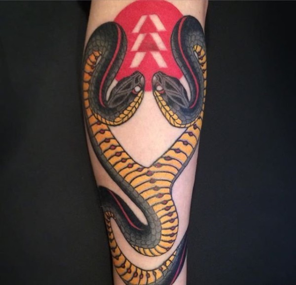 大腿上漂亮的玫瑰花与蛇纹身图案
