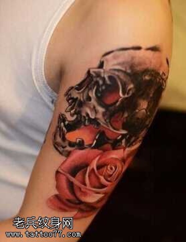 胳膊玫瑰骷髅纹身图案