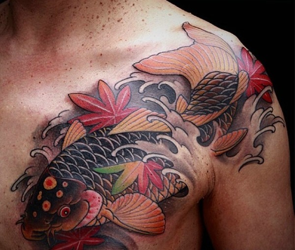 胸前彩色鲤鱼纹身刺青活力无限
