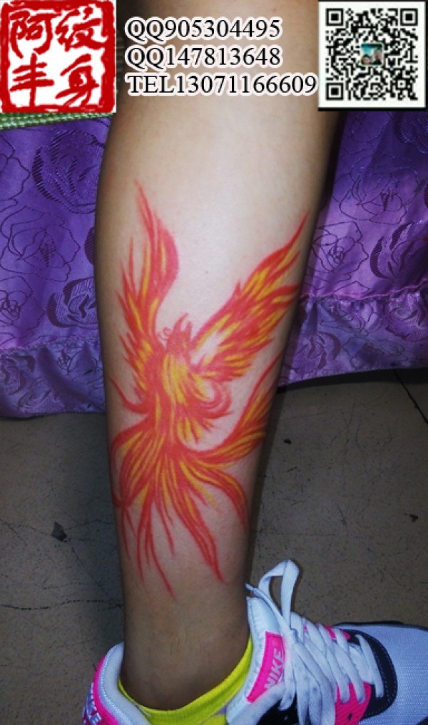 腿部彩色纹身 彩色凤凰纹身