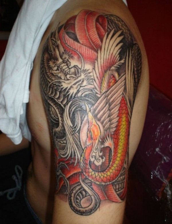 男子手大臂膀上的龙凤纹身图案