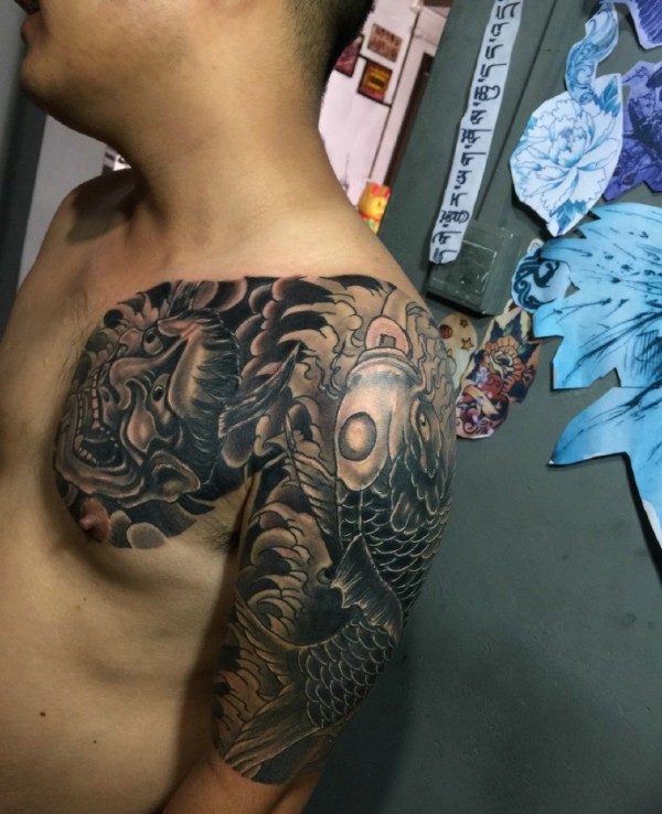 般若与鲤鱼混合的半甲纹身图案