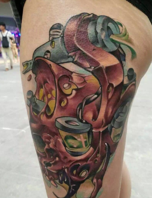 大腿外侧大型机械纹身图案