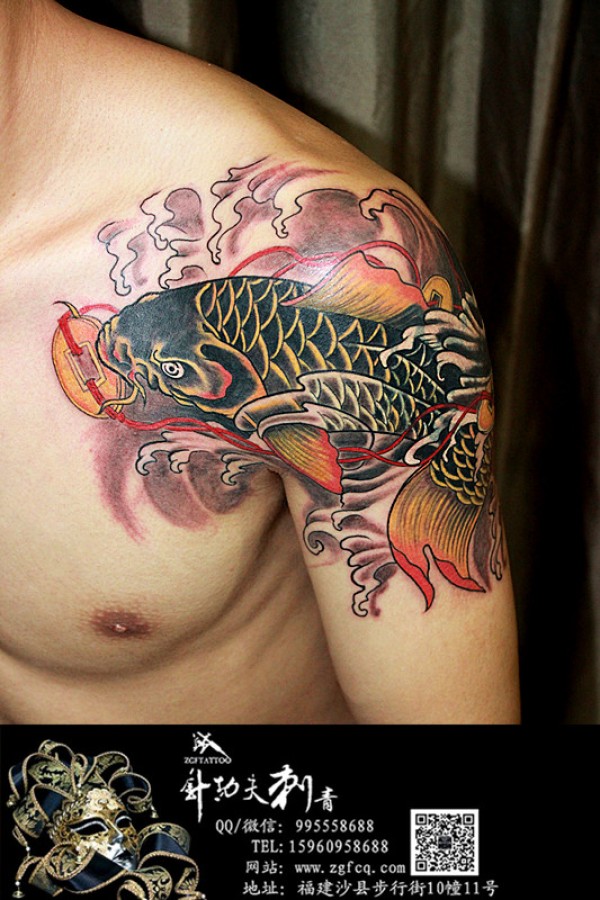 招财鲤鱼纹身--肩膀纹身--鱼纹身--福建针功夫胡宇刺青作品