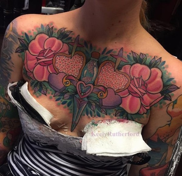 女生满胸洪亮的花朵和锁纹身图案