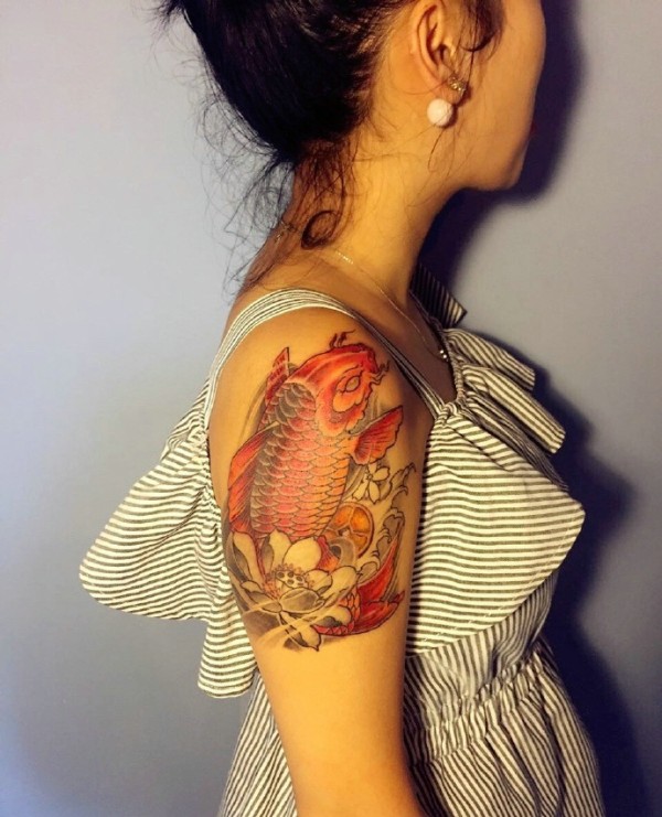 莲花与金鲤鱼的花臂纹身图案