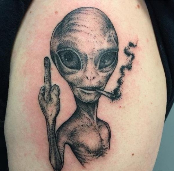 手臂上可爱的吸烟外星人纹身图案