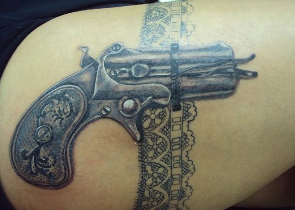女孩大腿上的环形初边和手枪纹身图案